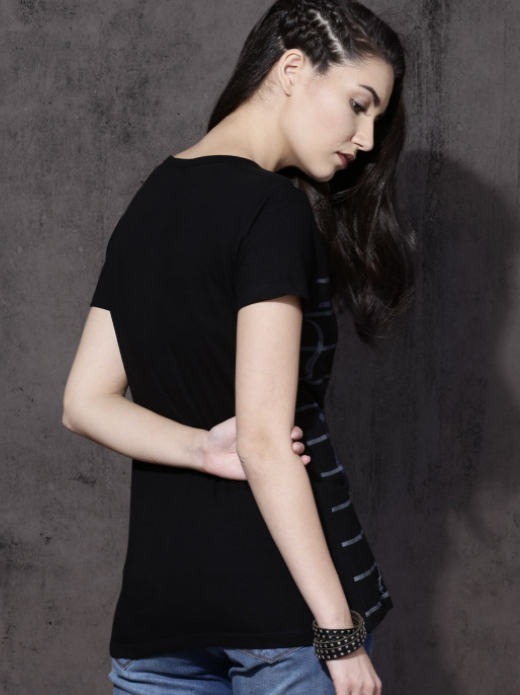 Black striped T-shirt, has a round neck, short sleeves